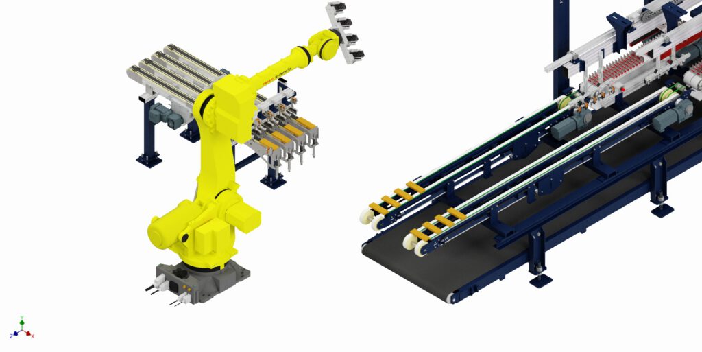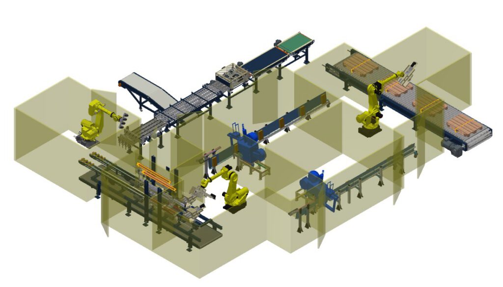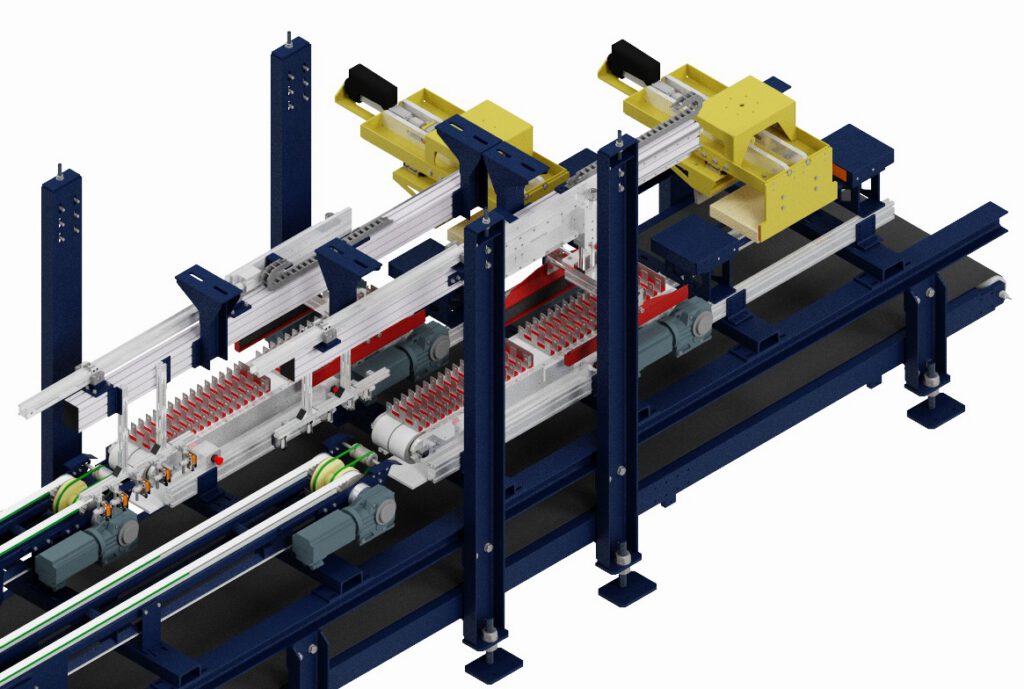 Voor Vandersanden realiseerden wij een geautomatiseerde handling- en verpakkingslijn voor het verwerken en verpakken van steenstrips. De lijn meet en controleert de stenen met scanners, sorteert afgekeurde stukken automatisch uit en voert daarna het stapelen, strappen en palletiseren uit. Het proces verloopt volledig automatisch tot en met de verpakte pallet.